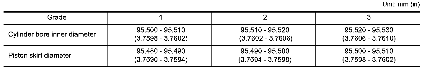 2.Determine the bore grade by comparing the measurement with the values under the cylinder bore inner diameter of the "PISTON SELECTION TABLE".