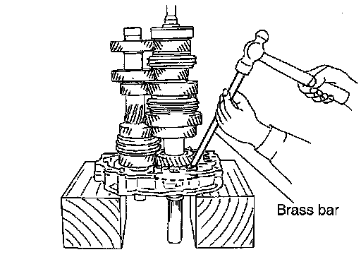 1.Install main drive gear assembly, mainshaft assembly, and counter shaft assembly combined in one unit to adapter plate, using a brass bar.