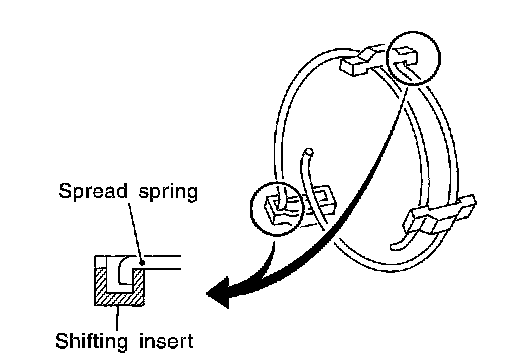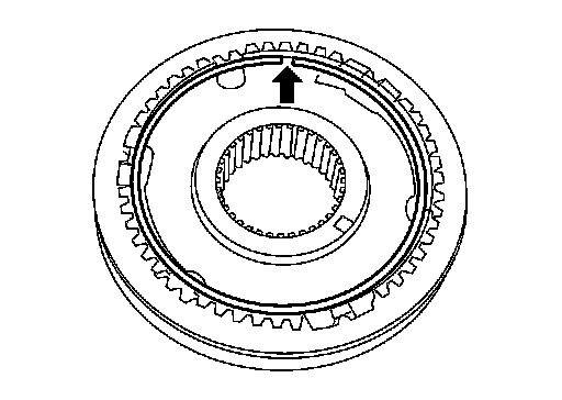 - Never align snap ring notch (black arrow) with synchronizer hub groove when assembling.