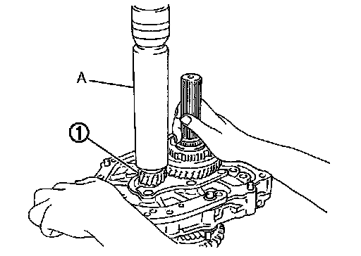 b.Install reverse counter gear (1) to counter shaft with a pressing machine, using the drift (A) [SST: ST-23860000 ( - )].