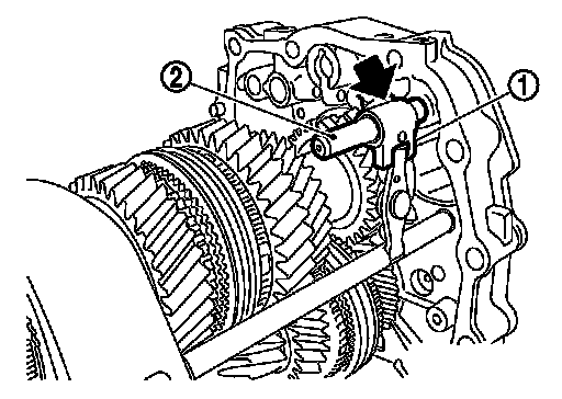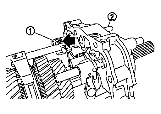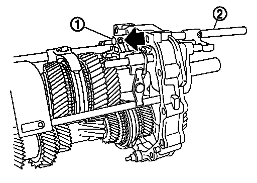 3.Install 5th-6th fork rod bracket (1) and 5th-6th fork rod (2) and then install retaining pin (black arrow) to 5th-6th fork rod bracket, using a pin punch [Commercial service tool].