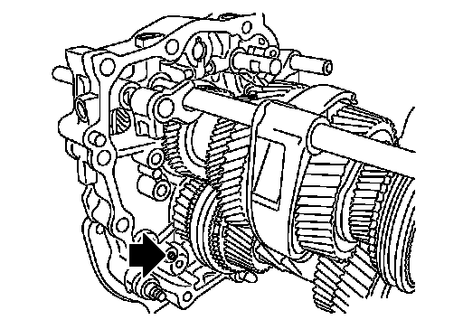 - Assemble retaining pin from the direction shown by the arrow in the figure until it becomes flush with the end surface of 5th-6th shift fork.