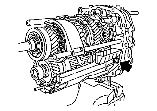 - Assemble retaining pin from the direction shown by the arrow in the figure until it becomes flush with the end surface of 3rd-4th shift fork.