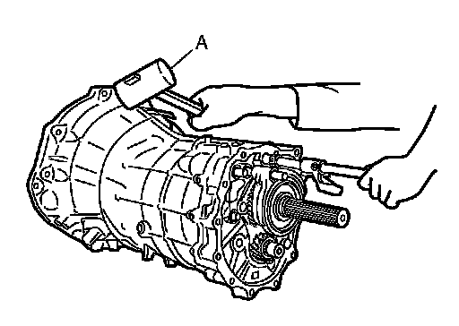 c.Carefully tap transmission case, using a soft hammer (A) and then separate adapter plate and transmission case.