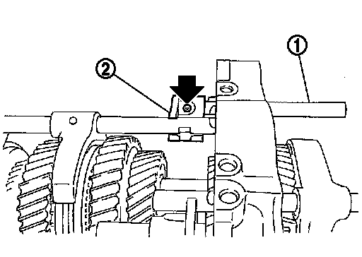 16.Remove retaining pin (black arrow), using a pin punch [Commercial service tool] and then remove 5th-6th fork rod bracket (1) and 5th6th fork rod (2).