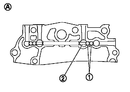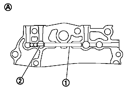 18.Remove retaining pin (black arrow), using a pin punch [Commercial service tool] and then remove 5th-6th shift fork (1) and 5th-6th fork rod (reversal side) (2).