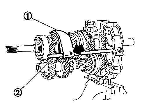 7.Remove retaining pin (black arrow), using a pin punch [Commercial service tool] and then remove 3rd-4th shift fork (1) and 3rd-4th fork rod (reversal side) (2).