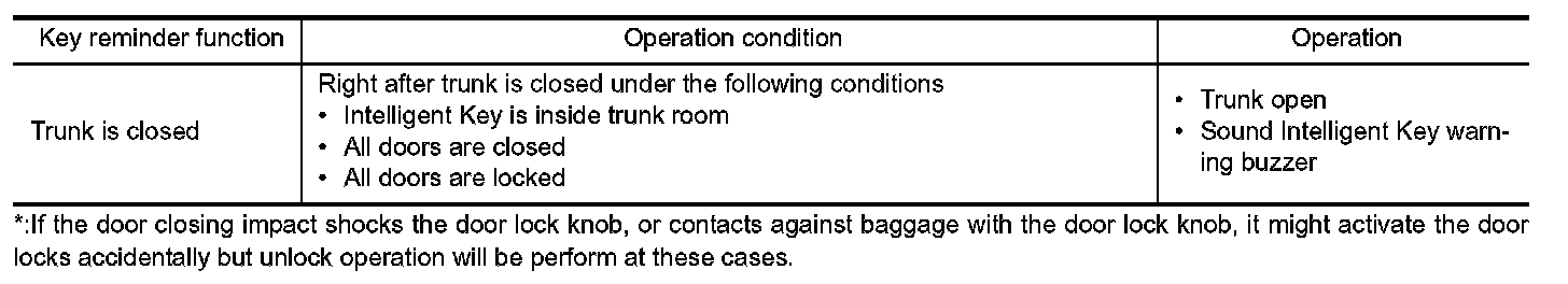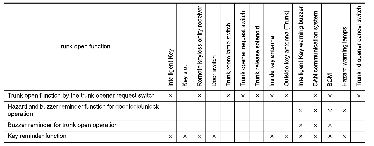- The Intelligent Key system is a system that makes it possible to open the trunk (trunk open function) by carrying the Intelligent Key which operates based on the results of electronic ID verification using two-way communications between the Intelligent Key and the vehicle (BCM).