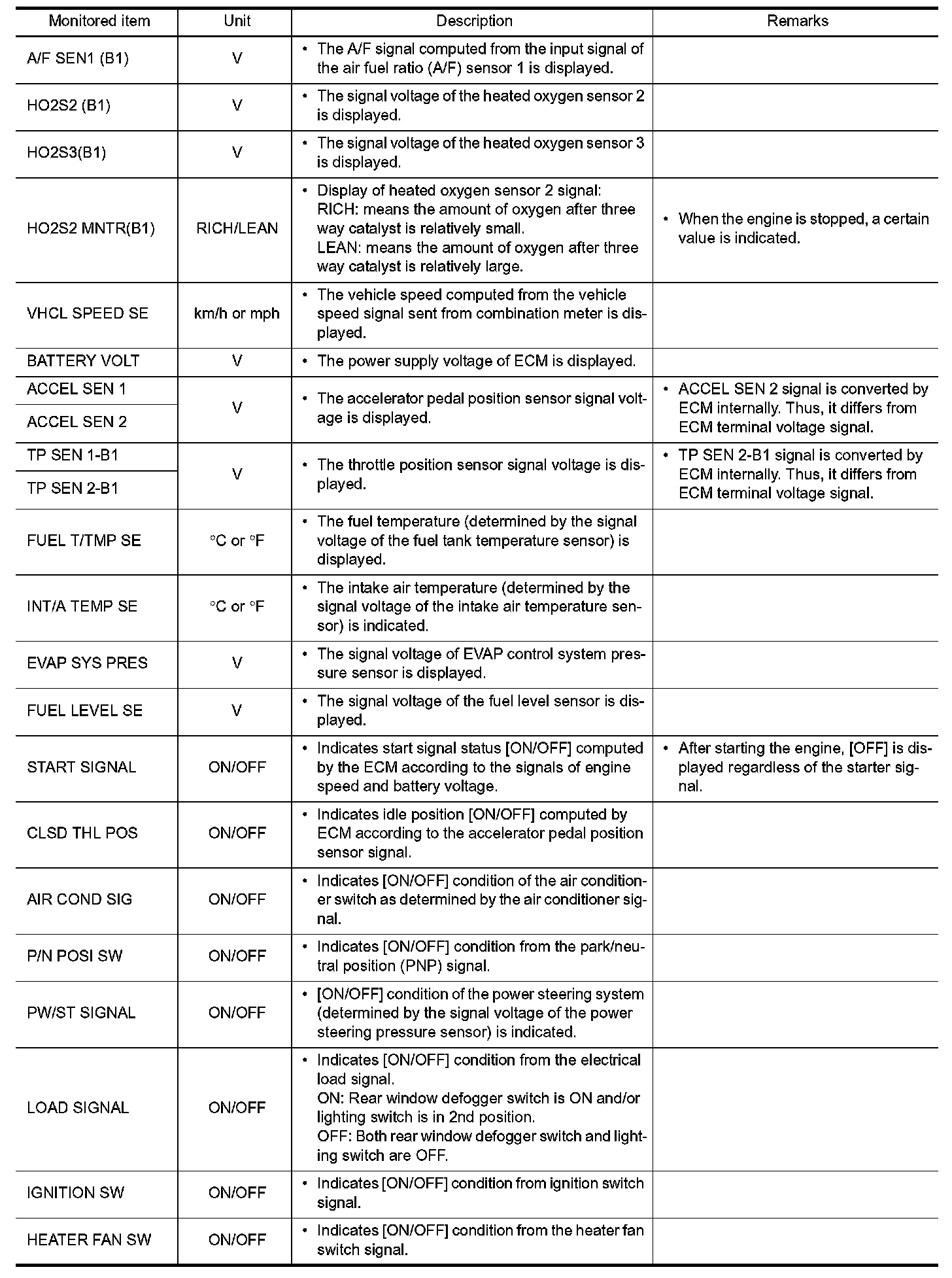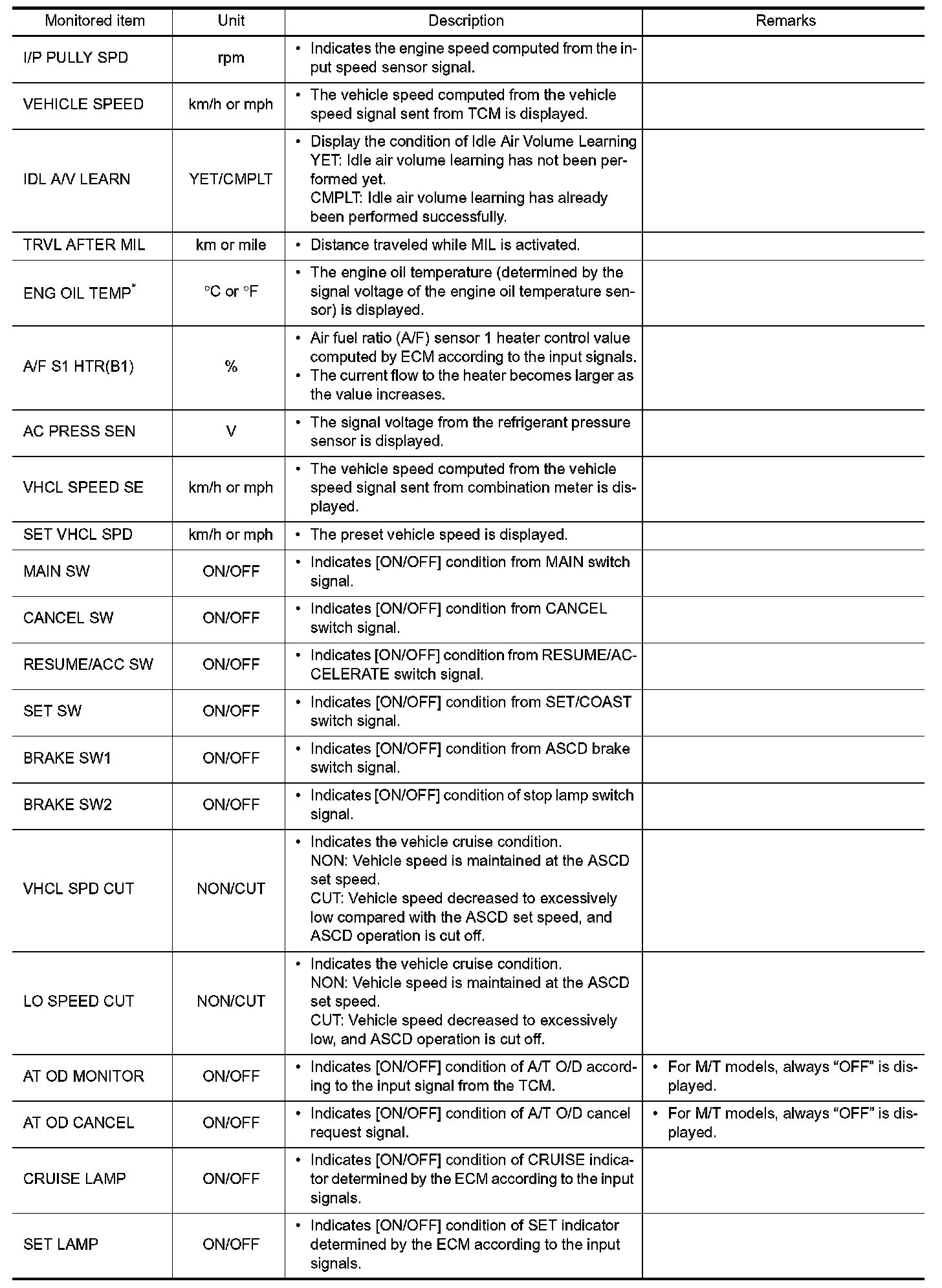 Any monitored item that does not match the vehicle being diagnosed is deleted from the display automatically.