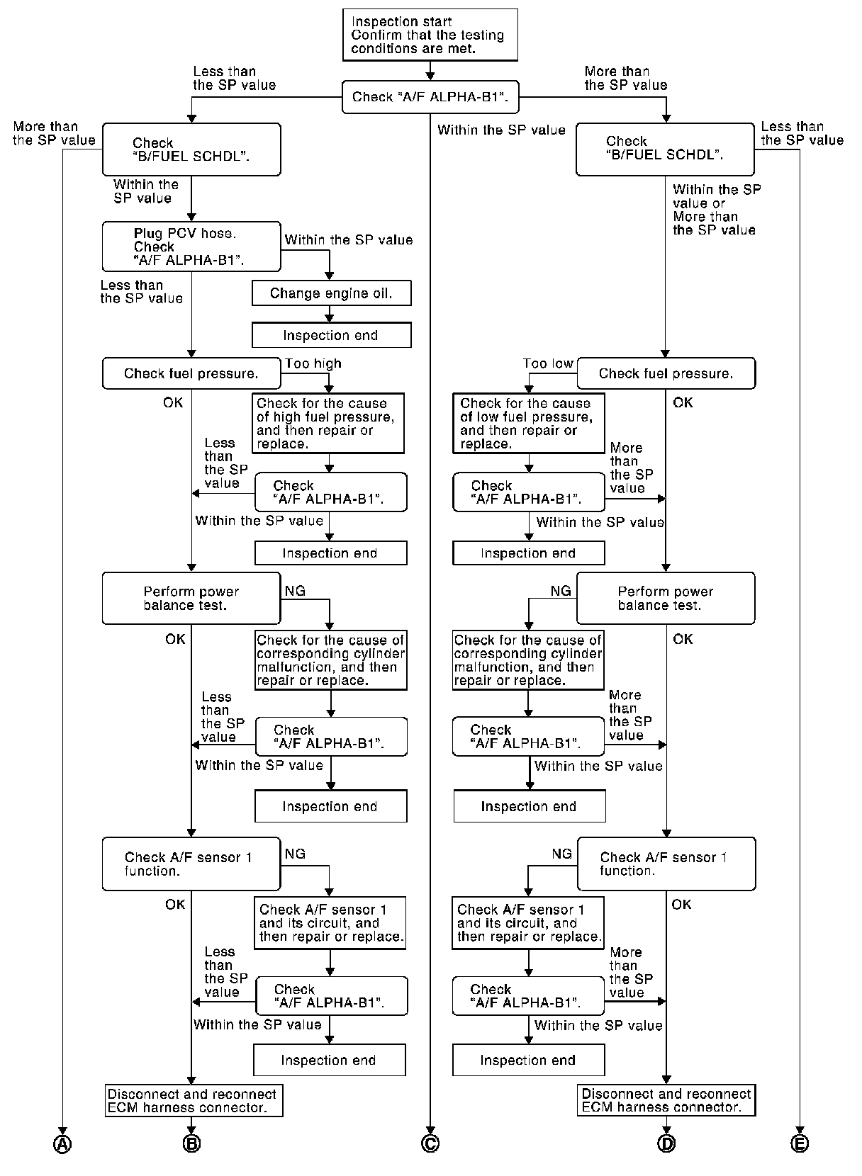 Select "A/F ALPHA-B1" and "B/FUEL SCHDL" in "SPEC" of "DATA MONITOR" mode, and make sure that the indication is within the SP value.