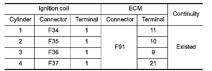 2.Check the continuity between ECM harness connector and ignition coil harness connector.