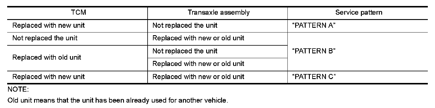 Perform the applicable service according to the following table when replacing TCM or transaxle assembly.