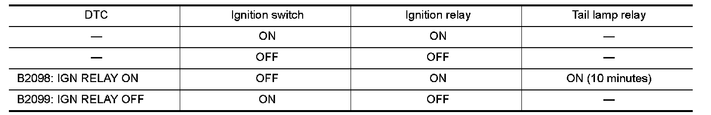 - If the ignition relay cannot turn OFF due to contact seizure, it activates the tail lamp relay for 10 minutes to alert the user to the ignition relay malfunction when the ignition switch is turned OFF.