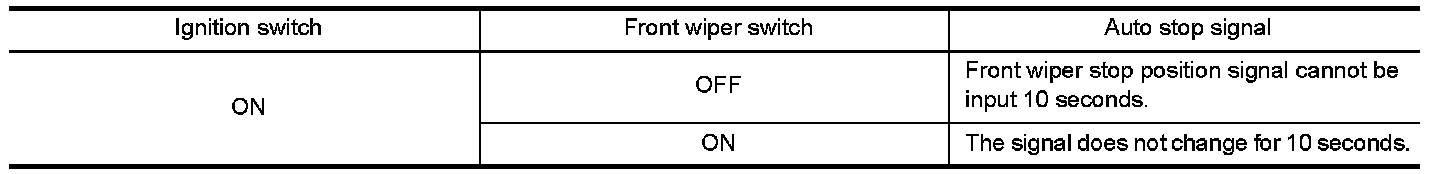 When a front wiper auto stop signal is in the conditions listed below, IPDM E/R stops power supply to wiper after repeating a front wiper 10 second activation and 20 second stop five times.