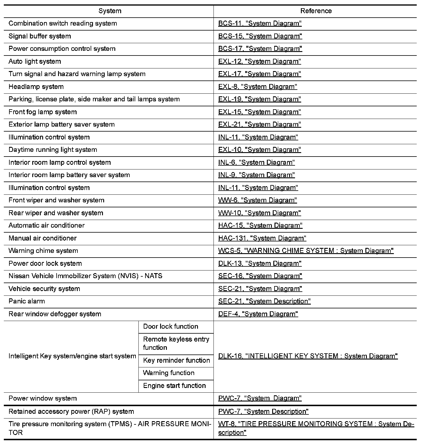 - BCM is equipped with the diagnosis function that performs the diagnosis with CONSULT and various settings.