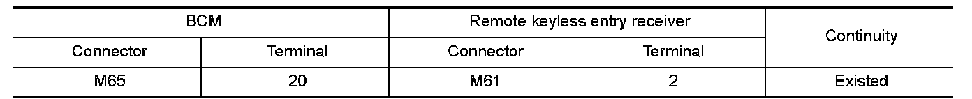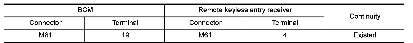 2.Check continuity between BCM harness connector and remote keyless entry receiver harness connector.