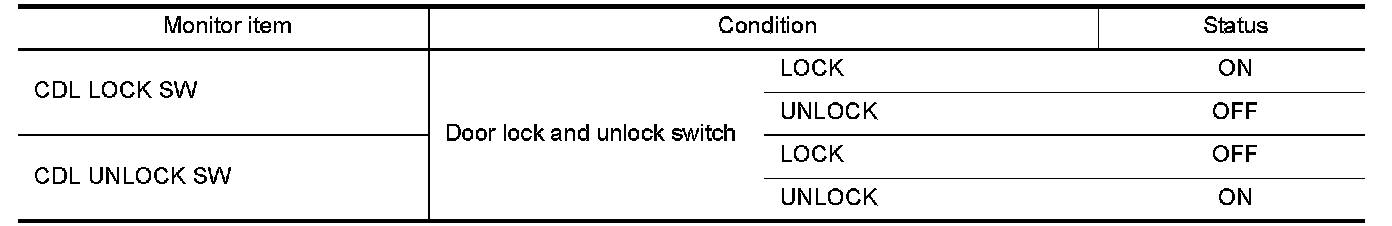 Check "CDL LOCK SW "and "CDL UNLOCK SW" in BCM "Data Monitor" mode using CONSULT.