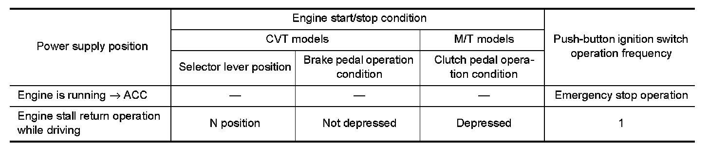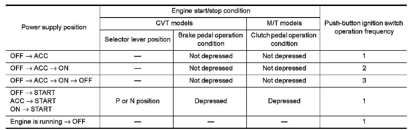 POWER SUPPLY POSITION CHANGE TABLE BY PUSH-BUTTON IGNITION SWITCH OPERATION