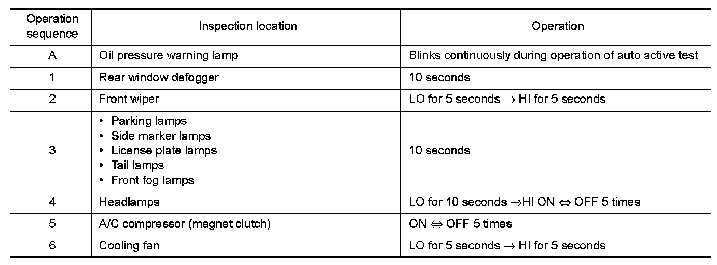 In auto active test mode, the IPDM E/R sends a drive signal to the following systems to check their operation.