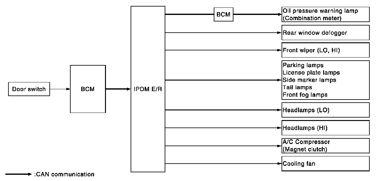- IPDM E/R starts the auto active test with the door switch signals transmitted by BCM via CAN communication. Therefore, the CAN communication line between IPDM E/R and BCM is considered normal if the auto active test starts successfully.