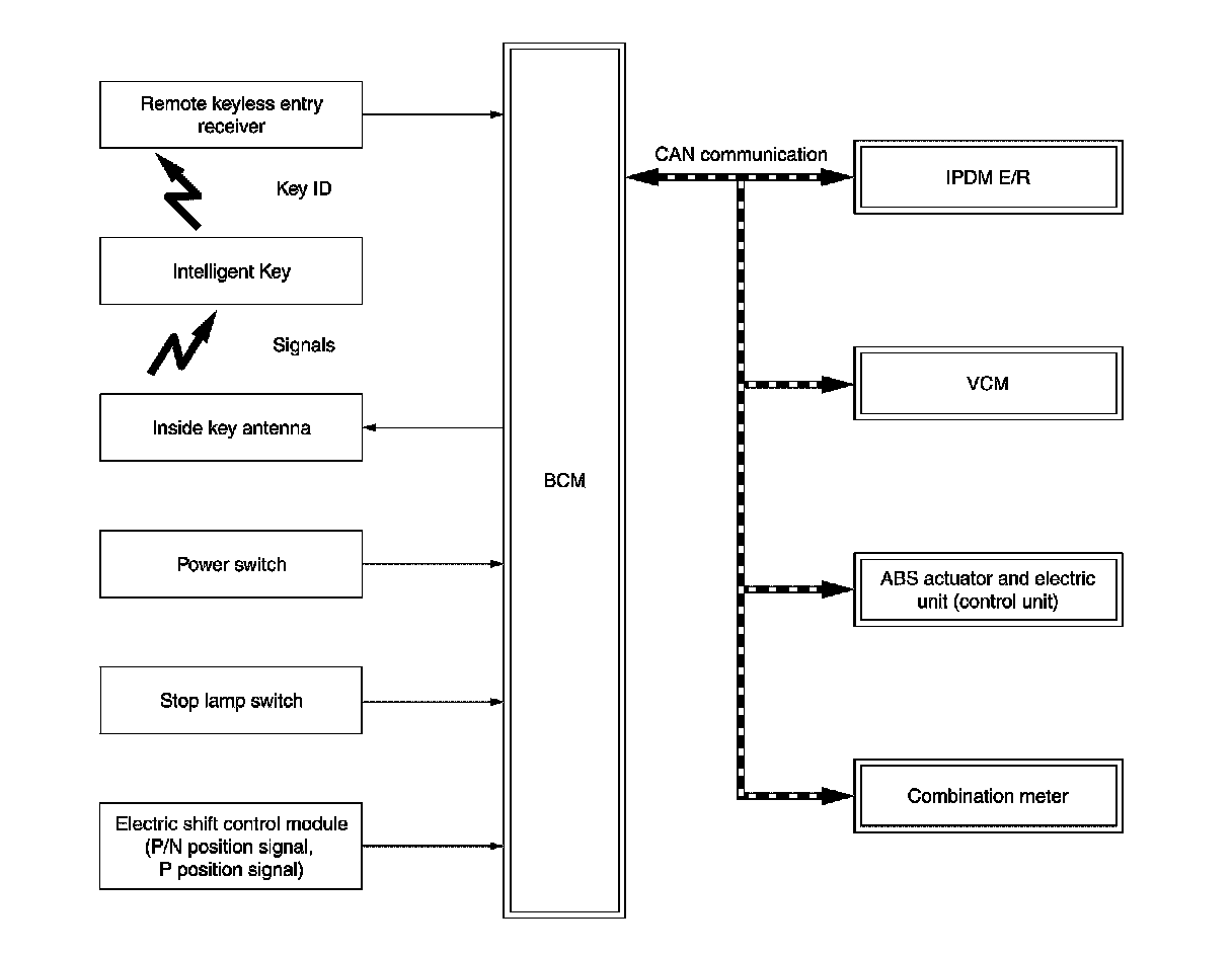 1.When the power switch is pressed, BCM activates the inside key antenna and transmits the request signal to the Intelligent Key.