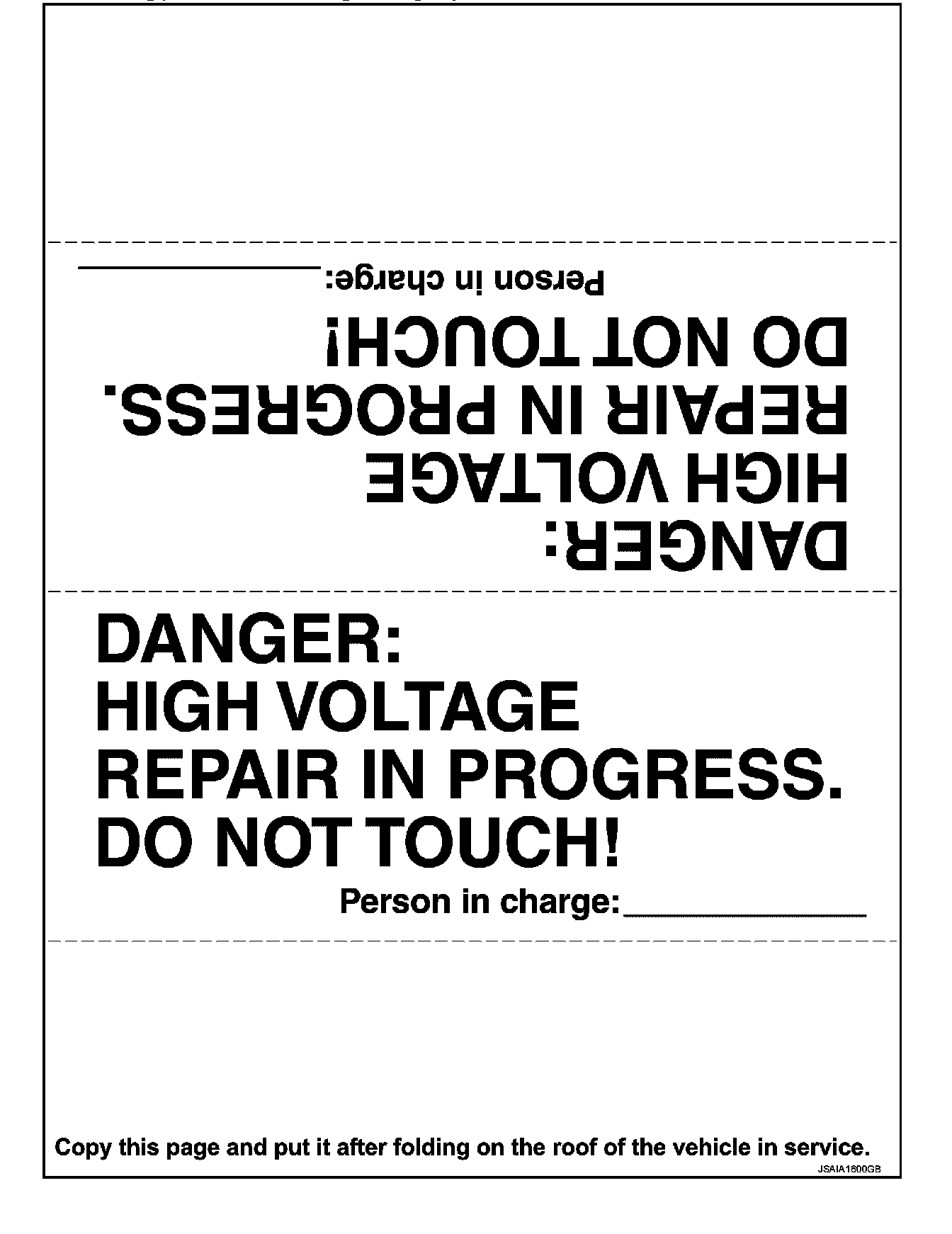 To call the attention of other workers, indicate "High voltage work in progress. Do not touch!" on vehicles where work is being performed on the high voltage systems.