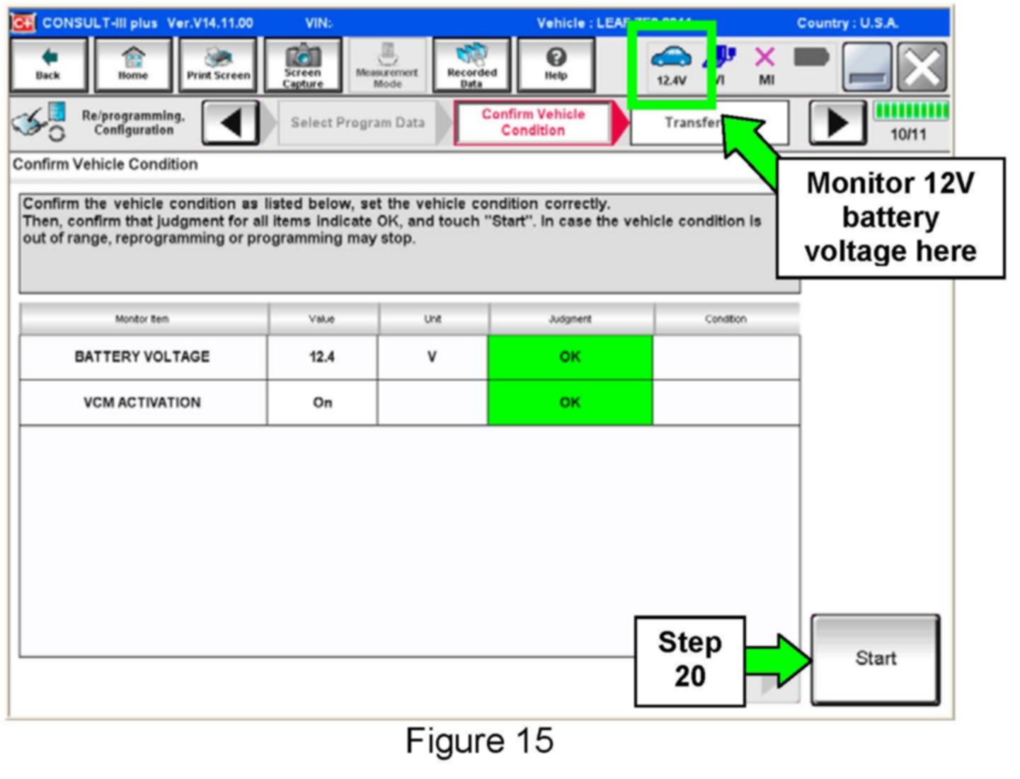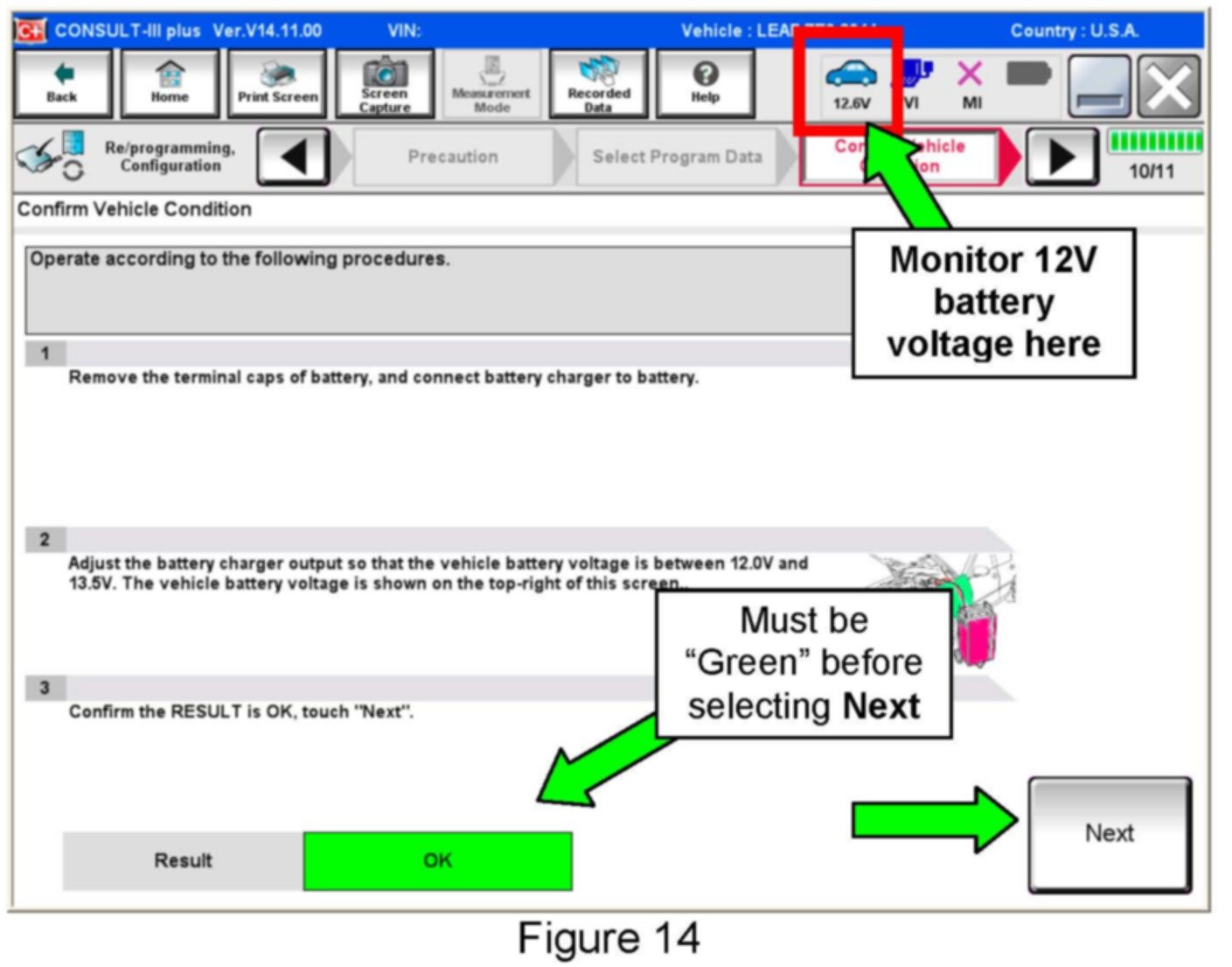 For reprogramming to continue, vehicle 12V battery voltage must stay within 12 volts and 15.5 volts. Make sure the voltage level is sufficient.