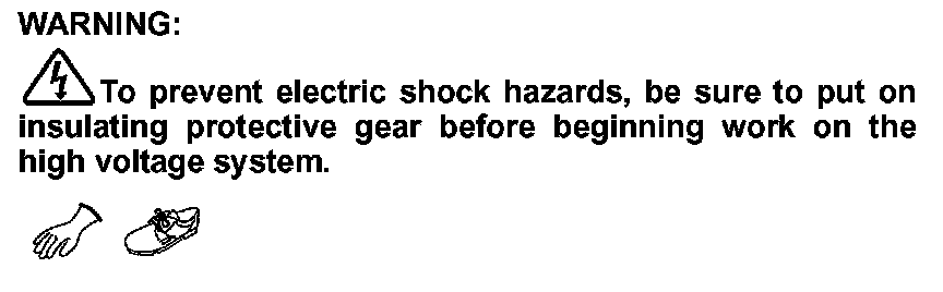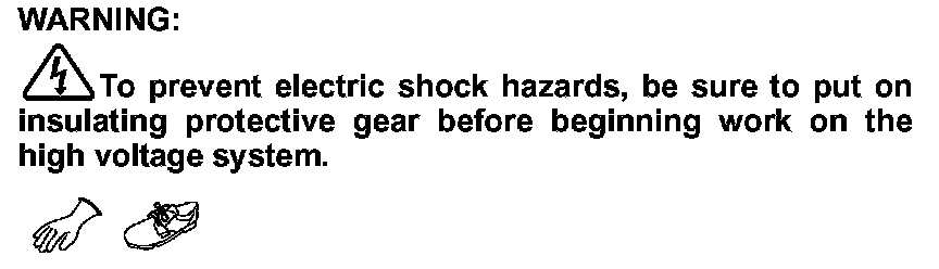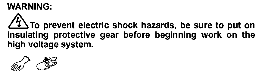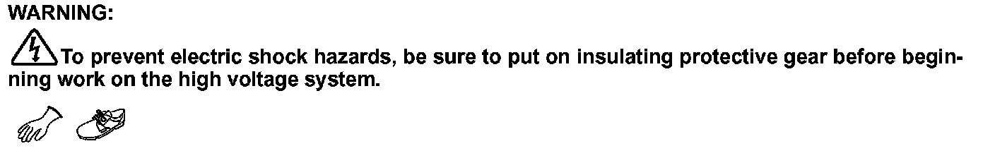- Be sure to wear insulating protective equipment consisting of glove, shoes, face shield and glasses before beginning work on the high voltage system.