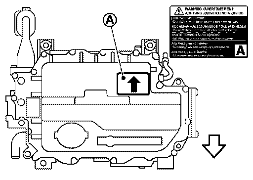 - If traction motor inverter was replaced, apply high voltage warning label at position (A), with top facing in the direction of arrow.