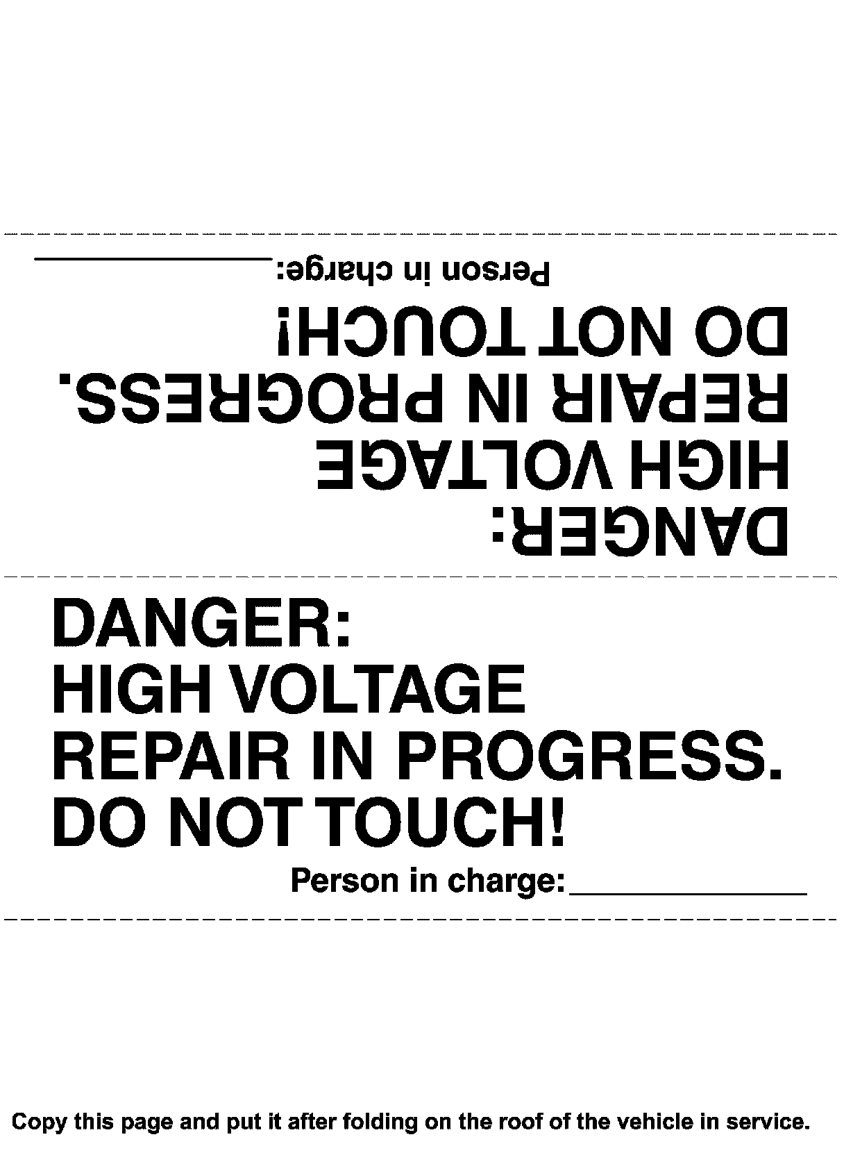To call the attention of other workers, indicate "High voltage work in progress. Do not touch!" on vehicles where work is being performed on the high voltage systems.