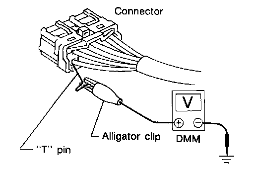 - The probe of a digital multimeter (DMM) may not correctly fit the connector cavity. To correctly probe the connector, follow the procedures below using a "T" pin. For the best contact grasp the "T" pin using an alligator clip.