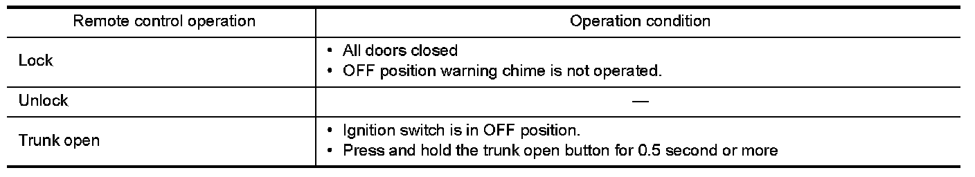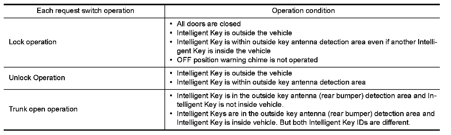 If the following conditions are not satisfied, door lock/unlock or trunk open operations will not response even if the request switch is operated.