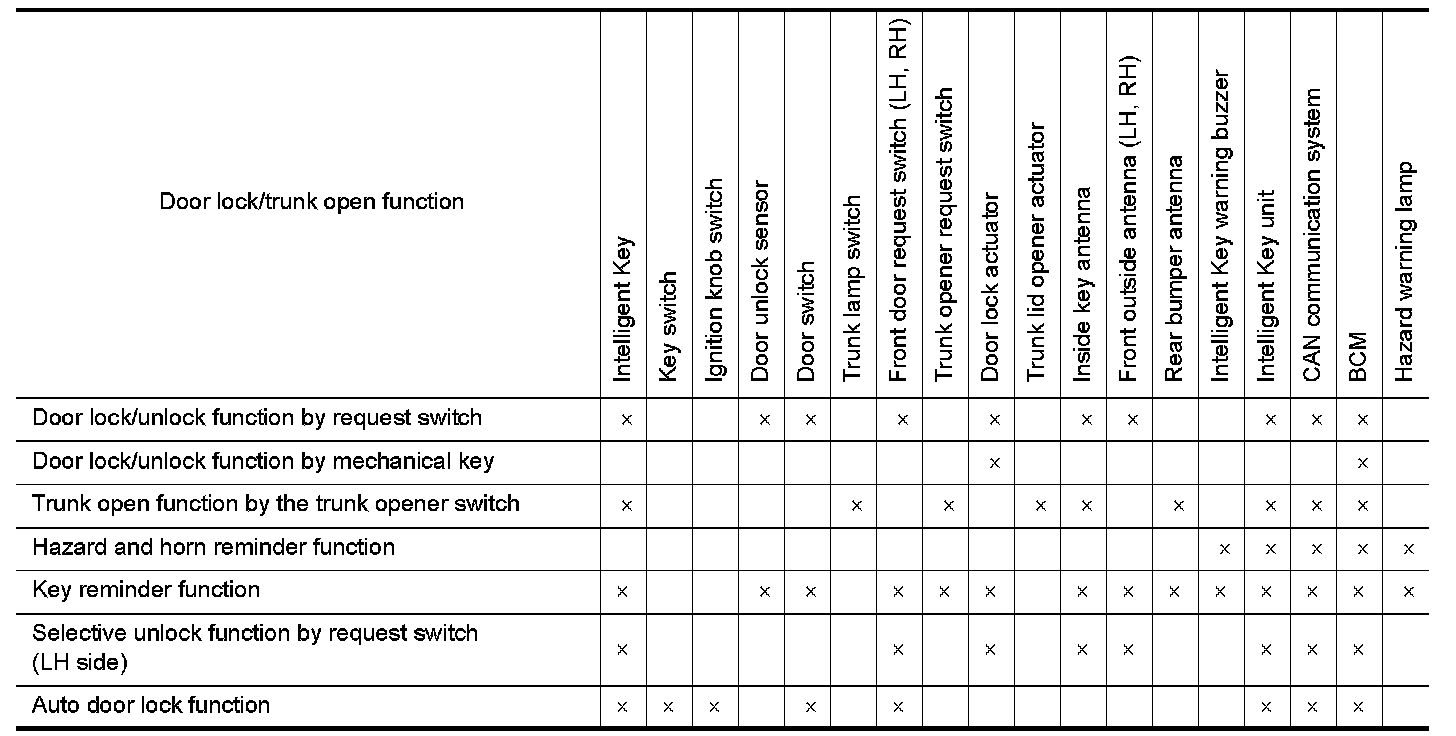 - Intelligent Key unit sends the door lock/unlock signal and sounds Intelligent Key warning buzzer (front of vehicle) warning (lock: 2 times, unlock: 1 time, trunk open: 4 times) at the same time.