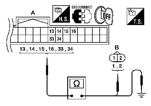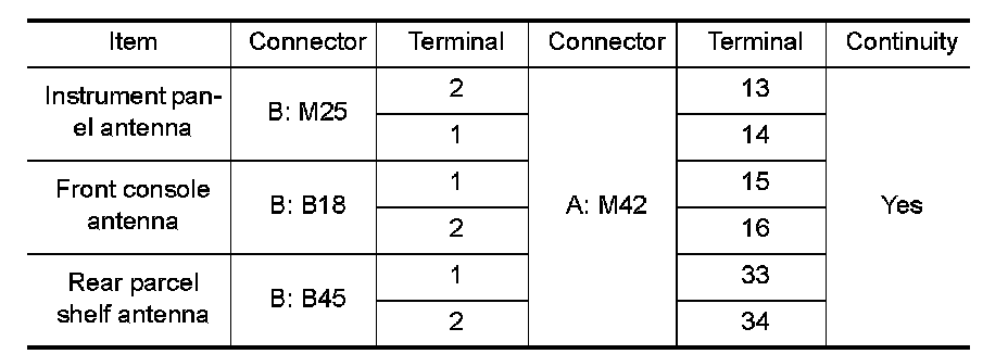 2.Check continuity between inside key antenna harness connector M25 (B) (instrument panel), B18 (B)