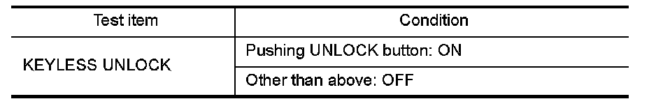 Check keyfob function in "DATA MONITOR" mode with CONSULT. When pushing unlock button of keyfob, the corresponding monitor item should be turned as follows.