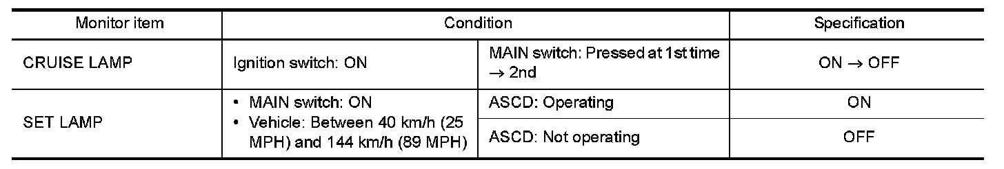 - SET/COAST switch on ASCD steering switch is turned ON while vehicle speed is within the range of ASCD