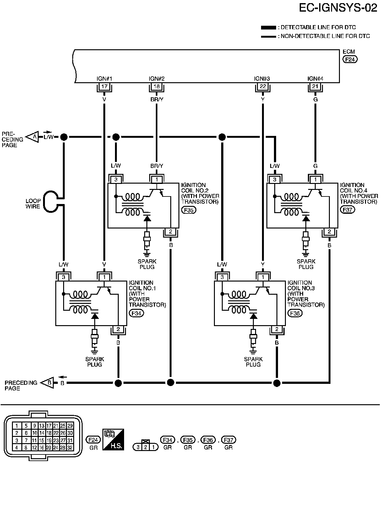 2.Check harness continuity between ECM terminals 17, 18, 21, 22 and ignition coil terminal 1.