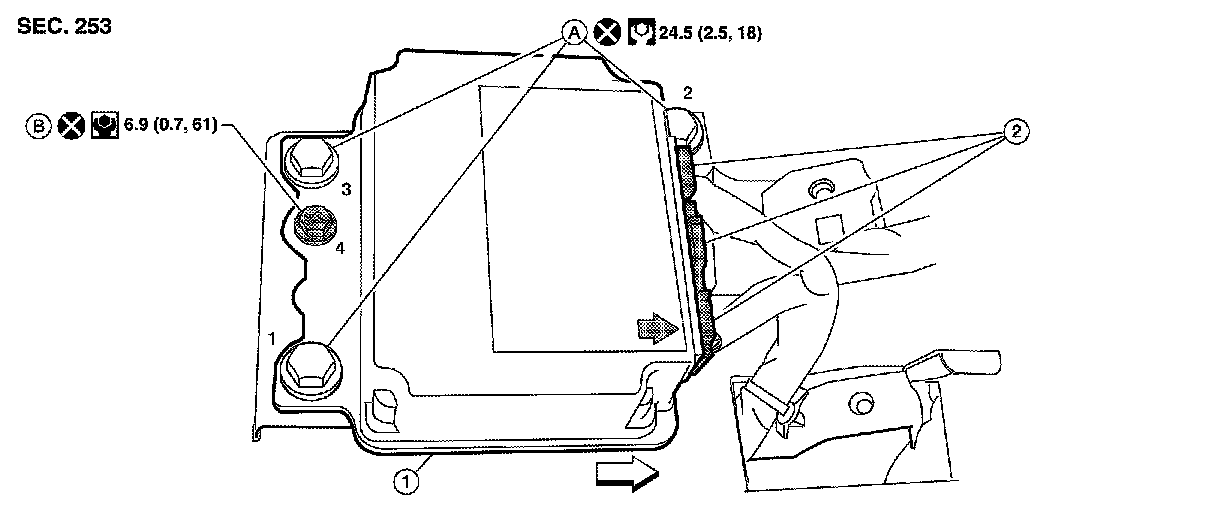 - After replacing the air bag diagnosis sensor unit, confirm using CONSULT that the ECU discriminated number (identification number) or part number of the new replacement air bag diagnosis sensor unit matches the ECU discriminated number (identification number) or part number of the replaced (old) air bag diagnosis sensor unit.
