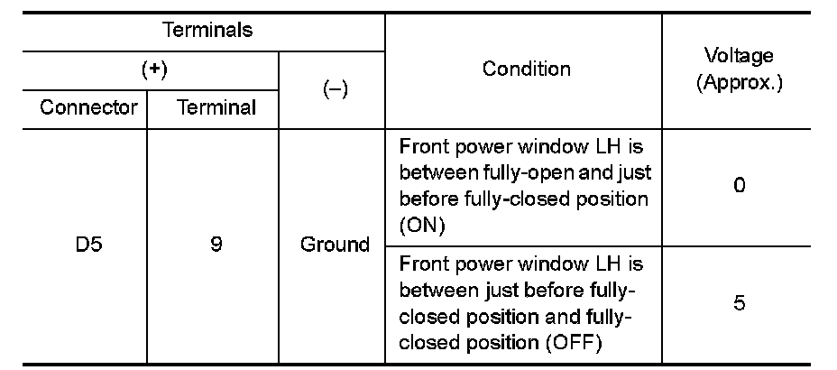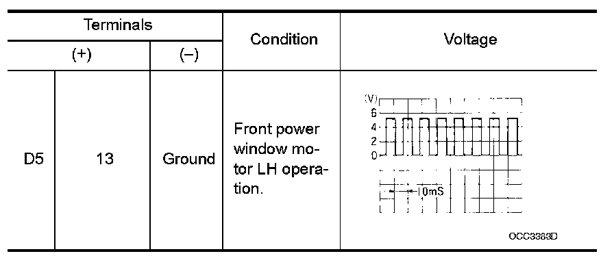 Measure voltage between main power window and door lock/unlock switch connector D5 terminal 13 and ground with oscilloscope when power window is in automatic closing operation.