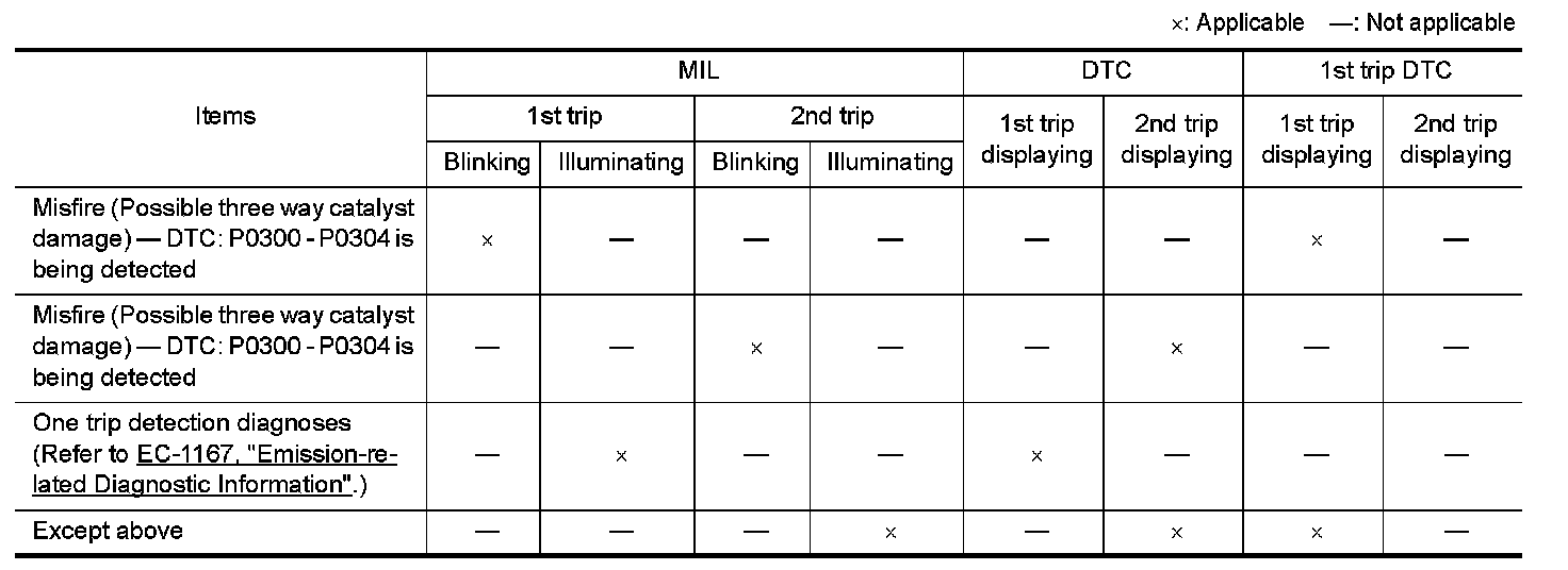 <2nd trip> The "trip" in the "Two Trip Detection Logic" means a driving mode in which self-diagnosis is performed during vehicle operation. Specific on board diagnostic items will cause the ECM to illuminate or blink the MIL, and store DTC and Freeze Frame data, even in the 1st trip, as shown below.