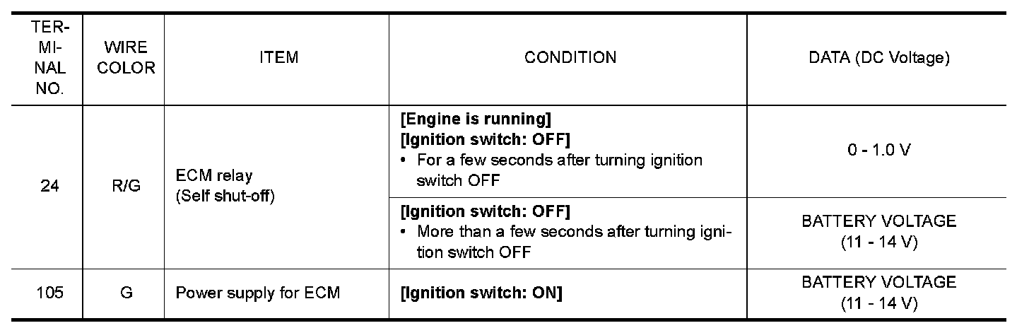 Never use ECM ground terminals when measuring input/output voltage. Doing so may result in damage to the ECM's transistor. Use a ground other than ECM terminals, such as the ground.