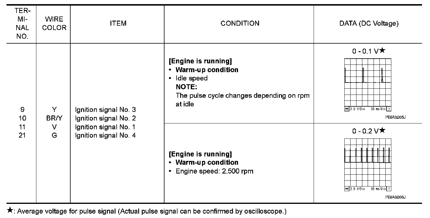 2.Read the voltage signal between ECM terminals 9, 10, 11, 21