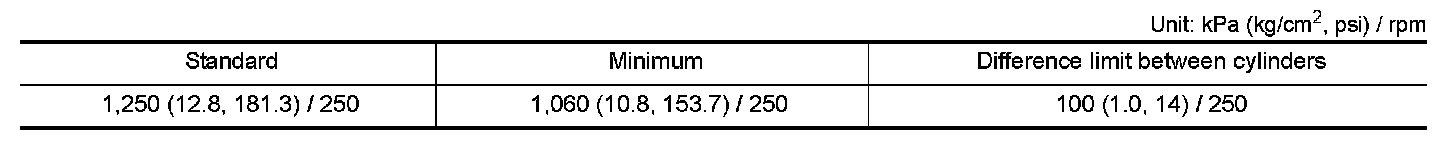- If compression pressure is below minimum value, check valve clearances and parts associated with combustion chamber (valve, valve seat, piston, piston ring, cylinder bore, cylinder head, cylinder head gasket).