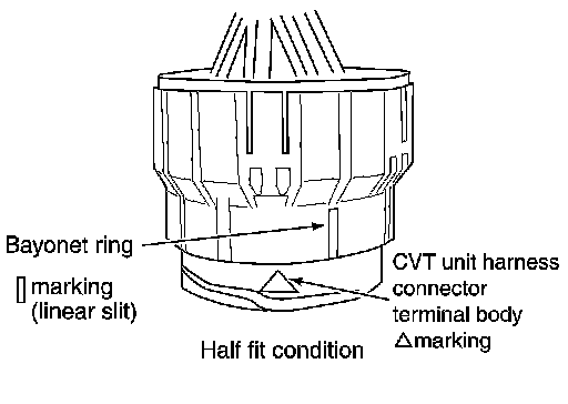 - Securely align CVT unit harness connector terminal body marking with bayonet ring marking (linear slit). Do not make a half fit condition as shown.