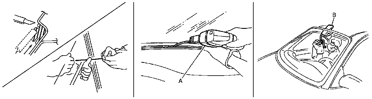 5.After removing windshield upper molding, remove glass using piano wire or power cutting tool (A) and an inflatable pump bag (B).