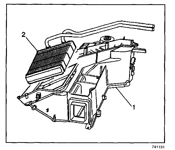1. Install the heater core (2) to the HVAC module assembly (1).