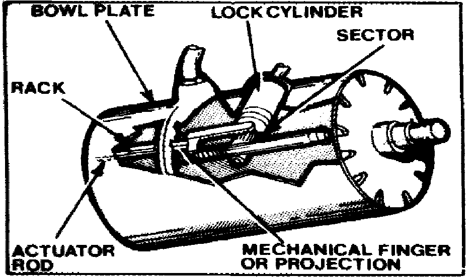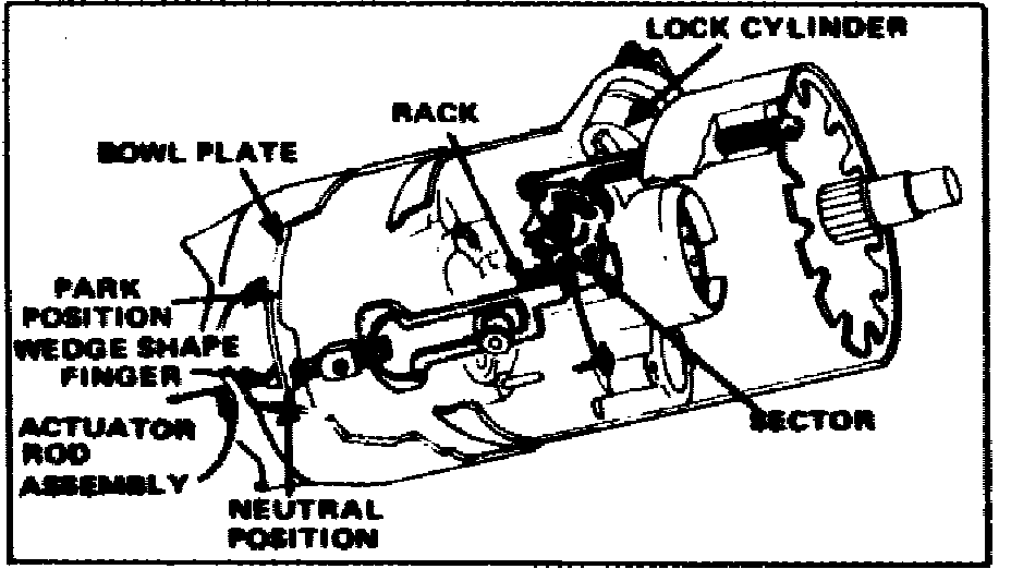 Actuation of the ignition switch is prevented by a mechanical lockout system, Figs. 6 and 7, which prevents the lock cylinder from rotating when the selector lever is out of Park or Neutral. When the selector lever is in Park or Neutral, the slots in the bowl plate and the finger on the actuator rod align allowing the finger to pass through the bowl plate in turn actuating the ignition switch, Fig. 8. If the selector lever is in any position other than Park or Neutral, the finger contacts the bowl plate when the lock cylinder is rotated, thereby preventing full travel of the lock cylinder.