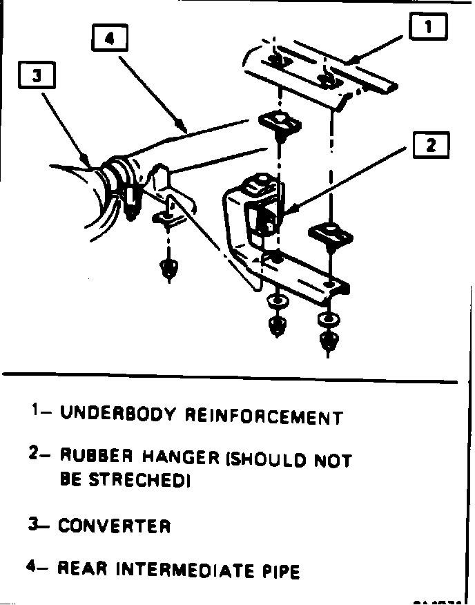 4. The unrelaxed hanger will transmit vibration through the floor pan and body structure. If this condition exists, loosen the exhaust joint ball flange, reposition the catalytic converter upwards to unload the hanger and retighten the exhaust system flange bolts to 20-24 N-m (15-17 ft.lbs.). An unrelaxed rubber hanger at the rear of the converter may also transmit exhaust moan noise into the car. It may be necessary to pry the hanger bracket downward slightly to relax the rubber hanger.