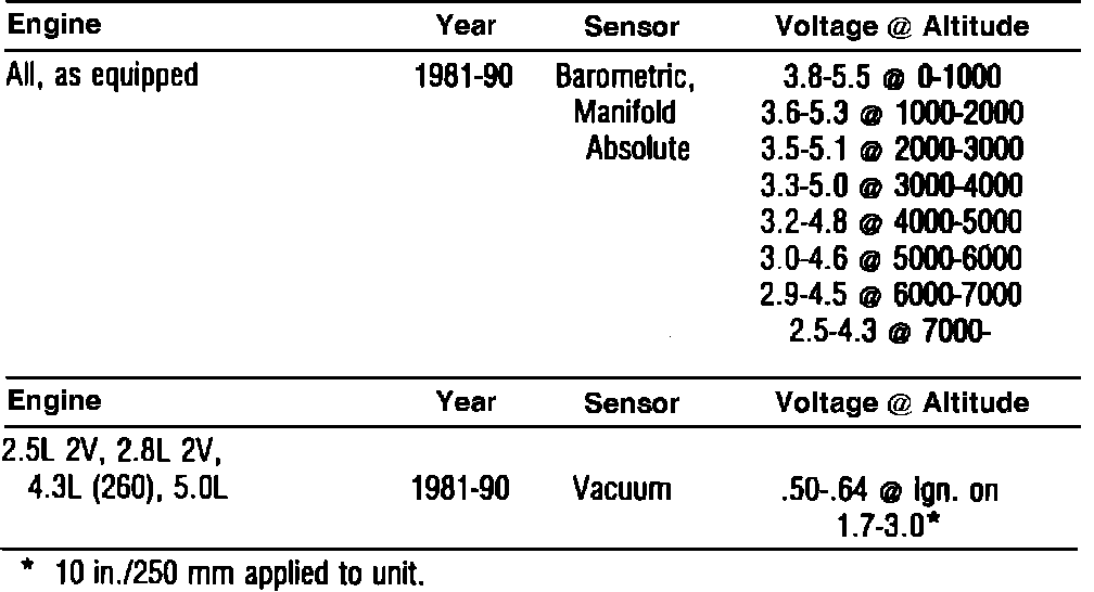 Manifold Absolute Pressure Sensors: Measure voltage with ignition on and engine off. Start engine and apply 10 in./250 mm Hg to unit, voltage should be: 3.8L Turbo 4V, 0.9-1.7 volts less; others, 1.2-2.3 volts less.