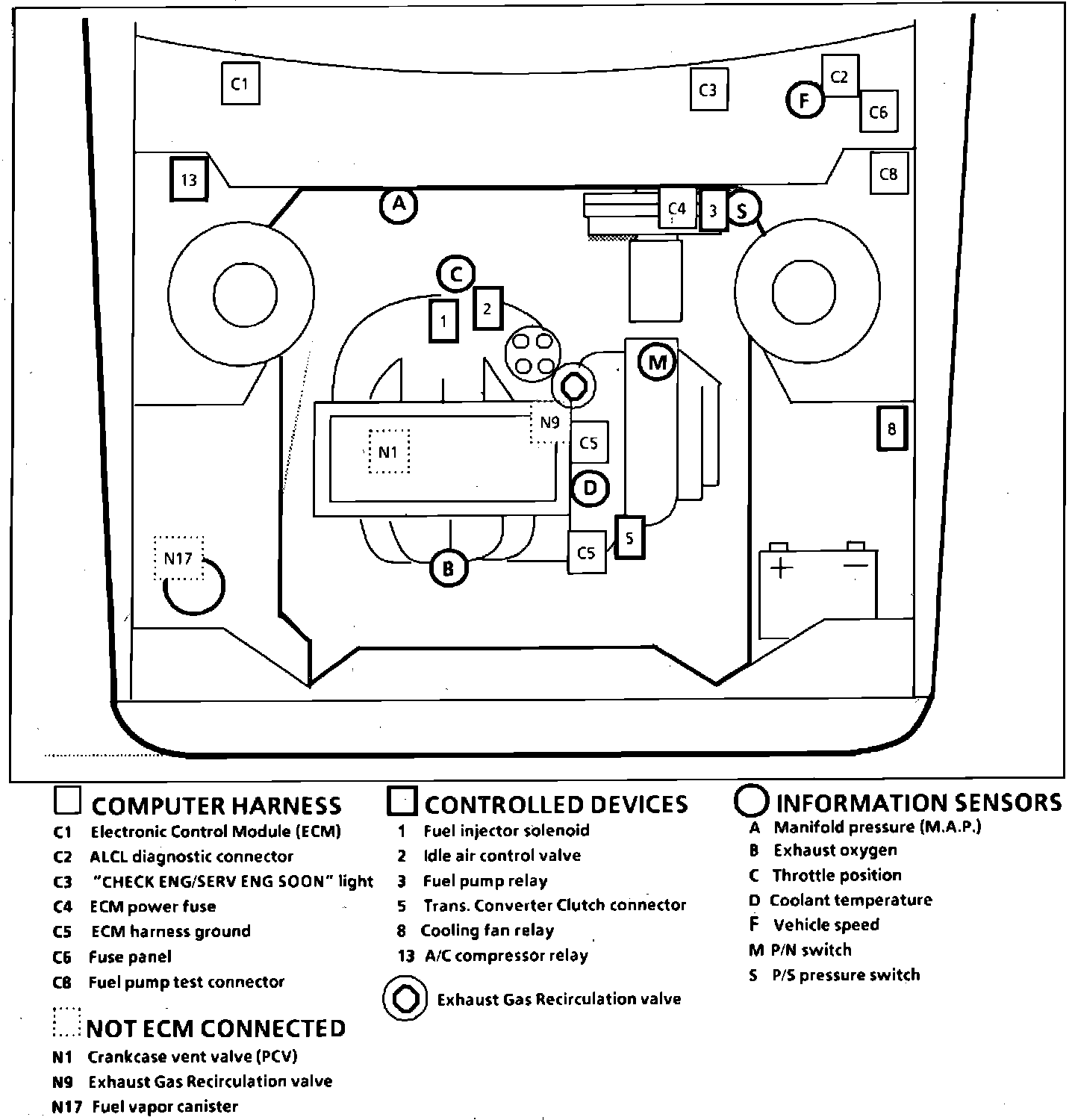 Fig. 37 Emission Component Location. 1985-86 Cavalier W/4-121/2.0L, TBI: